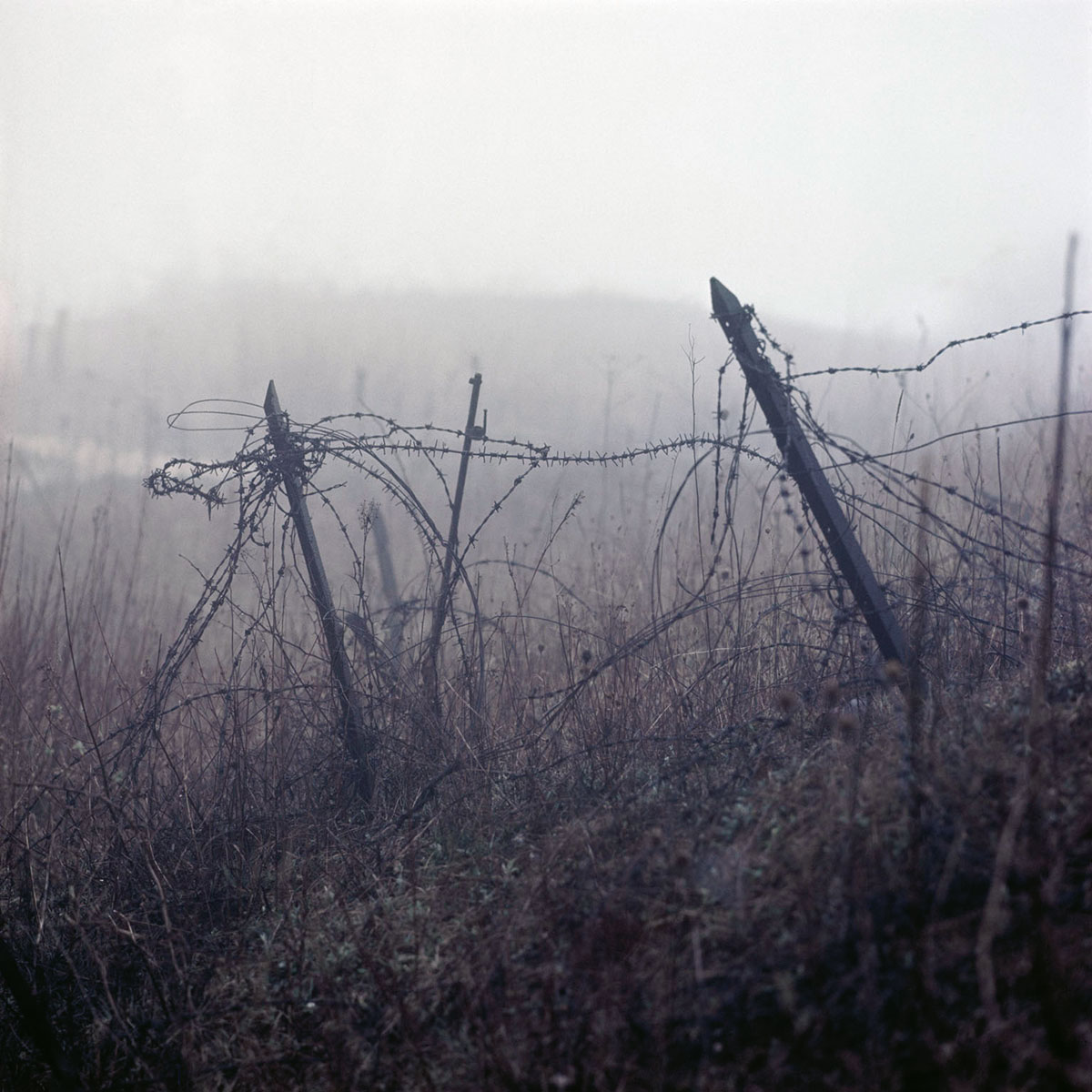 En 1966, soit cinquante ans après la bataille de Verdun, qui, avec ses milliers de morts, reste un des désastres de la Grande Guerre, Manuel Litran part en arpenter ses » champs d’honneur » pour le compte de Paris Match en compagnie de François Luizet. Des fils de fer barbelés délimitent une zone interdite pour cause de danger de mort. Bravant l’interdiction, le tandem s’aventure sur des terres abandonnées, où la végétation peine à repousser. La guerre est partout présente : trous d’obus, tranchées remplies d’eau de pluie, bidons, fusils, casques allemands et français, autant de débris oubliés, et que la terre n’a pas engloutis. Manuel Litran photographie en couleur ces traces, sans chercher à identifier précisément des lieux, qui offrent le même sentiment de désolation et de mort. De cet itinéraire, le photographe n’a conservé qu’une ligne tracée sur une carte d’état major au 1/25 000e. Le trajet, qui suit différents chemins autour du fort de Douaumont, passe par des villages détruits en 1916 et jamais reconstruits : Louvement-Côte-du-Poivre, Beaumont-en-Verdunois, Ornes, Bezonveaux. Les arbres plantés à la fin des années 1920 ont aujourd’hui fini par pousser dans cette Zone rouge, autour de vastes clairières, où les jeux, les pique-niques, la musique restent interdits et où des panneaux signalent l’emplacement de chacun des neufs villages » morts pour la France « .