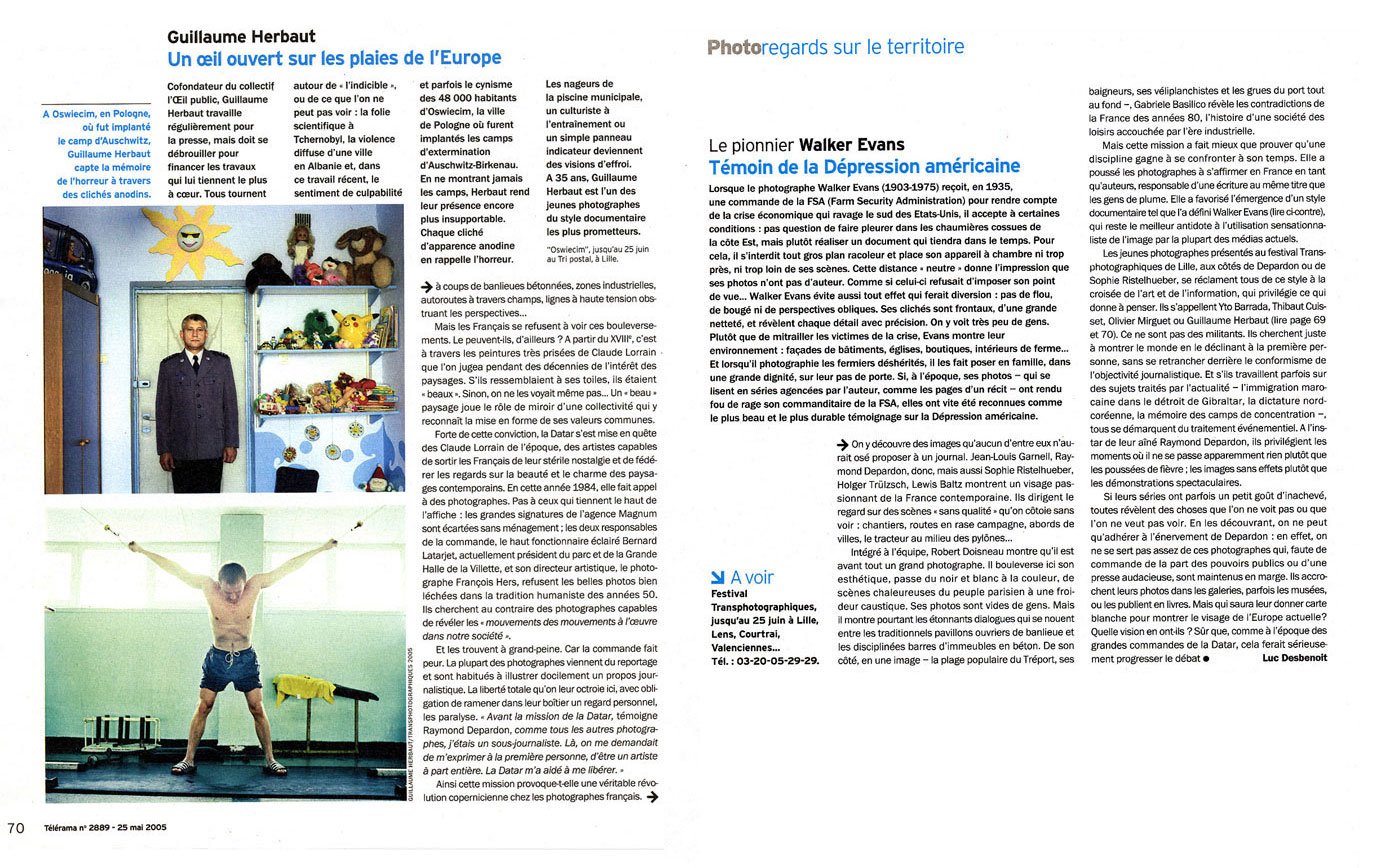 Cofondateur du collectif public. Guillaume Herbaut travaille régulièrement pour la presse, mais doit se débrouiller pour financer les travaux qui lui tiennent le plus a cœur. Tous tournent autour de l’indicible ou de ce que l’on ne peut pas voir : la folie scientifique à Tchernobyl, la violence diffuse d’une ville en Albanie et, dans ce travail récent, le sentiment de culpabilité et parfois le cynisme des 48 000 habitants d’Oswiecim, la ville de Pologne où furent implantés les camps d’extermination d’Auschwitz Birkenau. En ne montrant jamais les camps. Herbaut rend leur présence encore plus insupportable. Chaque cliché d’apparence anodine en rappelle l’horreur.