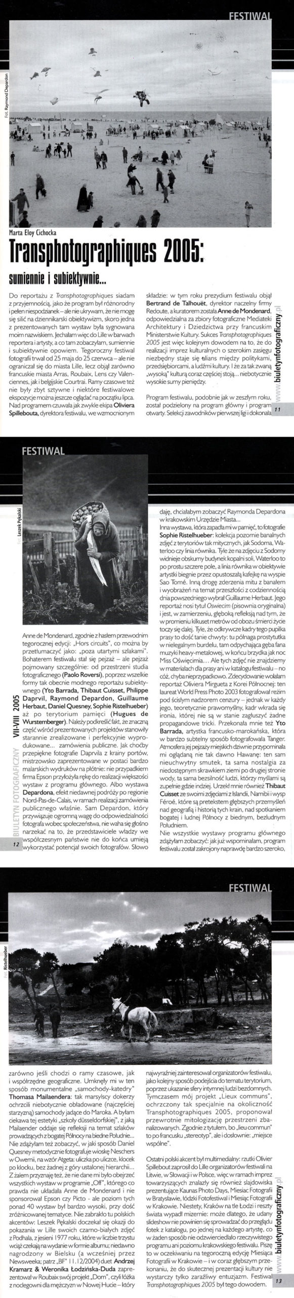 Biuletyn Fotograficzny : Transphotographiques 2005, sumiennie i subiektywnie Post Tags 2005Andrzej KramarzAnne de MondenardArtiste Hauts De FranceBertrand de TalhouëtClaude CourtecuisseDaniel QuesneyFemmes PhotographesGuillaume HerbautHugues de WurstembergerJean-Philippe CharbonnierKimiko YoshidaLeszek PekalskiManuel LitranMarta Eloy CichockaMaster of PhotographyOlivier MirguetOlivier SpilleboutPalais des Beaux Arts de LillePaolo RoversiPhilippe DapvrilPhotographe ItalienPhotographe polonaisPhotographie RégionalePolognePozytywPressePresse InternationaleRaymond DepardonSophie RistelhueberThibaut CuissetTrans 2005ValenciennesWeronika Lodzinska-DudaYto Barrada Share Post