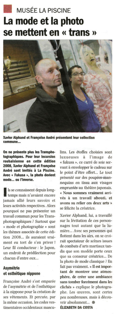 On ne présente plus les Transphotographiques. Pour leur incursion roubaisienne en cette édition 2008, Xavier Alphand et Françoise André sont invités à La Piscine. Avec « Fukusa », la photo devient mode… ou l’inverse.